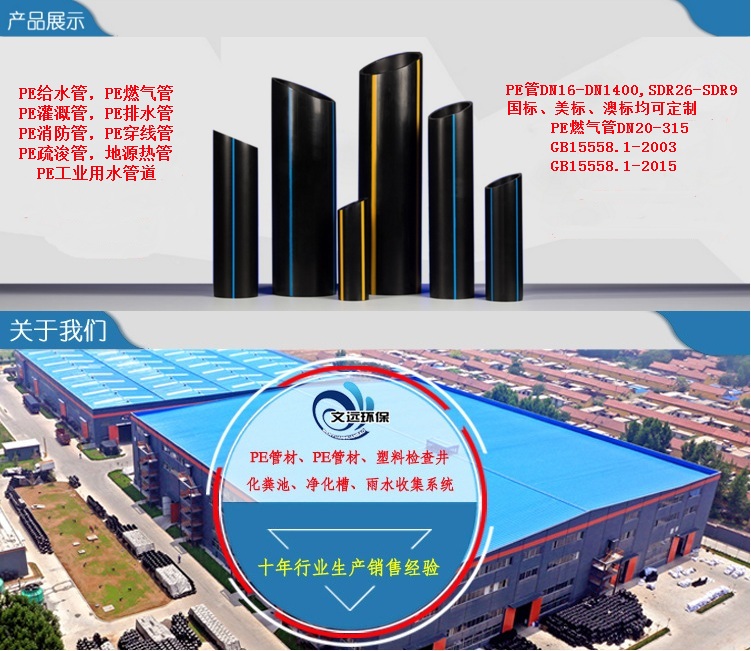 pe管材采用挤出工艺,尺寸自小到大规格梗概如次de(mm),de16 de20 de25 de32 de40 de50 de63 de75 de90 de110 de125,de160 de200 de250 de315……一直至de1400。